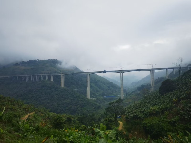小蚌嘎特大桥全长1132米,主桥桥跨组合为(67+150+180+150+67)米三向预应力混凝土连续刚构,为跨越河谷而设,最大墩高138米,主梁为分幅式单箱单室变截面连续箱梁,单幅箱梁顶板宽12.5米,底板宽7米,箱高以1.8次抛物线变化,采用菱形挂篮进行施工。