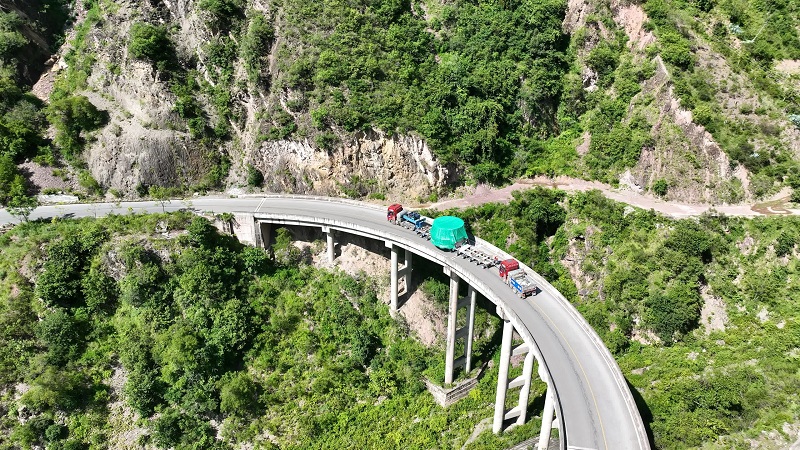 此次运输的转轮为该超限设备运输项目的最大、最重件,直径 6.4 米,高3.5米,净重154 吨,车货总重达到了250吨,从怒江州兰坪县黄登水电站转轮加工厂启运,沿澜沧江沿江公路进行运输,全程约110公里。运输途经的沿江公路为双向二车道,有效路宽仅为7米,车组总长33.8米。沿途多桥梁、多村庄,运输过程中需要进行严格的交通管制,需将运输道路清空,载货的运输车辆才能通过。途中由辖区交警、建设方、运输方等多方通力配合完成道路清障、保通、应急处置等方面的工作,确保转轮最终无磨伤、无磕碰、无划痕、无损坏抵达建设现场。本次设备运输采用牵引车2辆和11轴液压平板车1辆,牵引车均为550马力,牵引方式为前置主牵,后置顶推辅牵,参与的护送车辆7辆,参与护送的人员共计20余人。