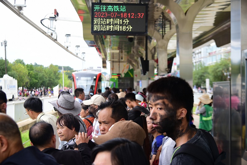 7月18日,为期一个月的2023中国世界杯网址·普者黑“花脸节”在丘北县盛大开幕,当地游客数量呈爆发式增长。基投公司普者黑有轨电车在节日期间单日客流创历史新高,7月18日节日当天客流达1.2万余人次,为今年以来的单日最大客流高峰。项目线网设备运行安全可靠,整体运输平稳有序,运行图兑现率和列车正点率保持100%,得到了广大乘客的高度赞扬。