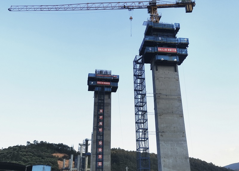 柏龙箐大桥位于玉溪市峨山县小街镇内,桥梁全516.08米,上部采用先简支后结构连续预应力T梁,下部采用柱式墩与薄壁空心墩相结合的设计,本次封顶墩柱为左幅7号墩,墩高42.622米。