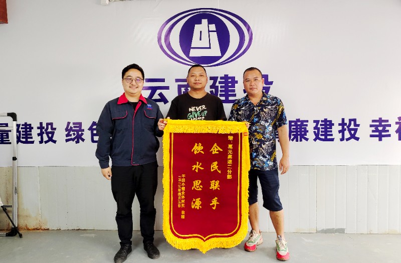 “你们实实在在替大家解决了困难,这面锦旗是干田村全体村民的心意!”5月7日,戛洒镇磨刀村村委会干田小组组长刀明受全组村民委托,手持“企民联手,饮水思源”的锦旗来到十四公司第三直管部永金高速(戛元段)二分部,感谢项目部免费提供管件,解决了干田小组37户共计147人的饮水困难问题,让村民喝上了干净、安全、放心的自来水。
