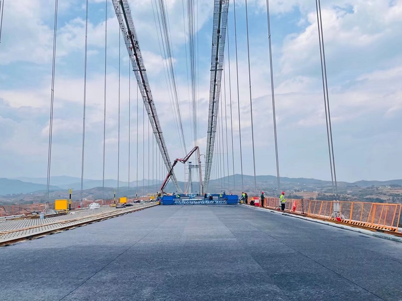 4月3日,永大高速控制性工程永仁大桥(江底河特大桥)主桥UHPC桥面铺装完成。