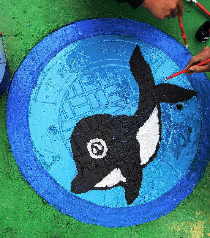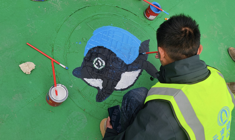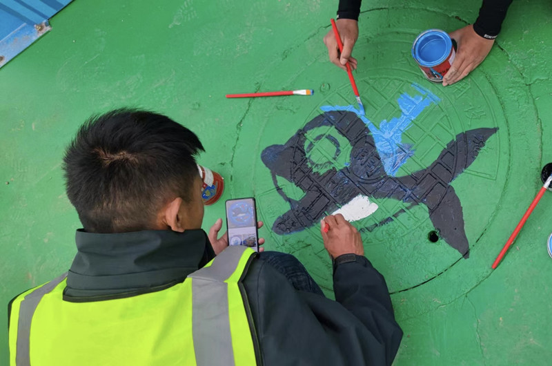项目驻地有多处井盖,看着这些井盖,项目副经理杨涌突然萌发了一个想法——“我们也可以在上面画画。”这个想法吸引了大家的兴趣,井盖彩绘活动也由此展开。项目管理人员以井盖为画布,手持画笔与调色盘,一笔一笔认真勾画。大家发挥聪明才智,相互配合,共同完成了一幅幅作品。“我正在画这副小海豚,马上完工了,别看大伙平常都是和钢筋、混凝土打交道,但是我们也同样心灵手巧。”工长虎恩见说道。