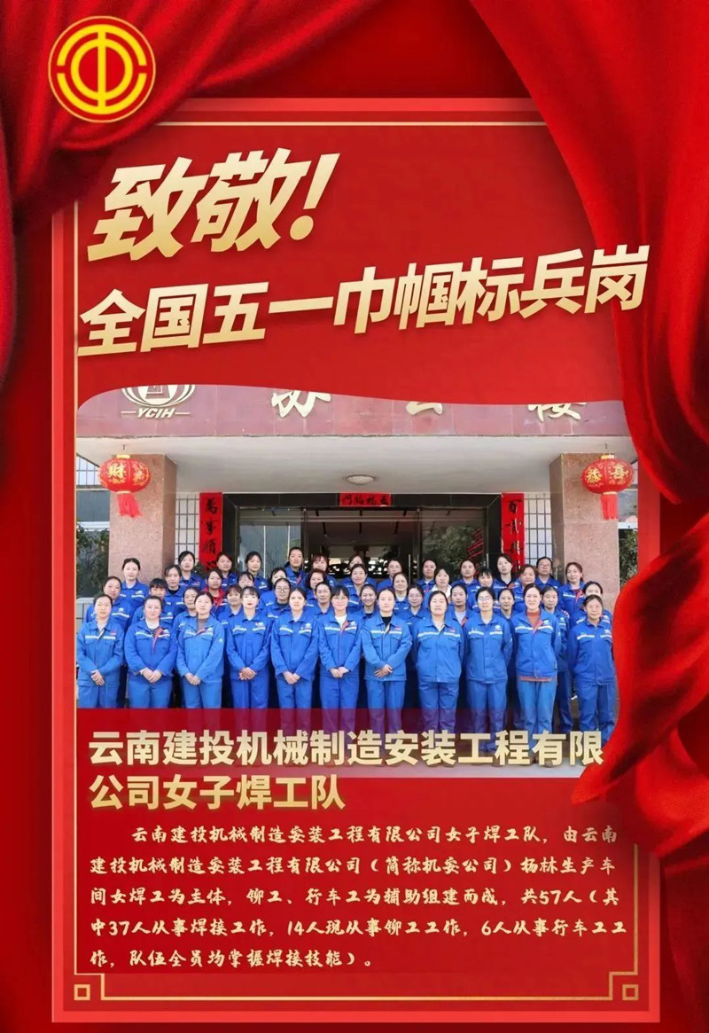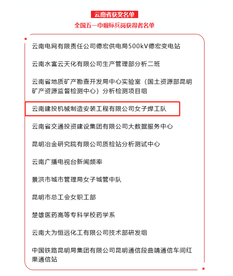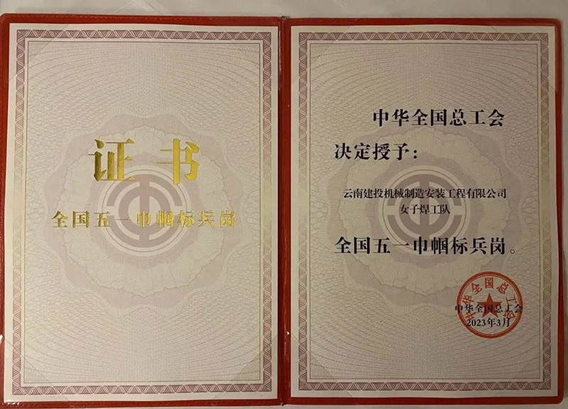 世界杯官网合作平台机械制造安装工程有限公司女子焊工队被授予全国五一巾帼标兵岗称号,女子焊工队队长孙梅作为云南省获表彰的代表到会领奖。