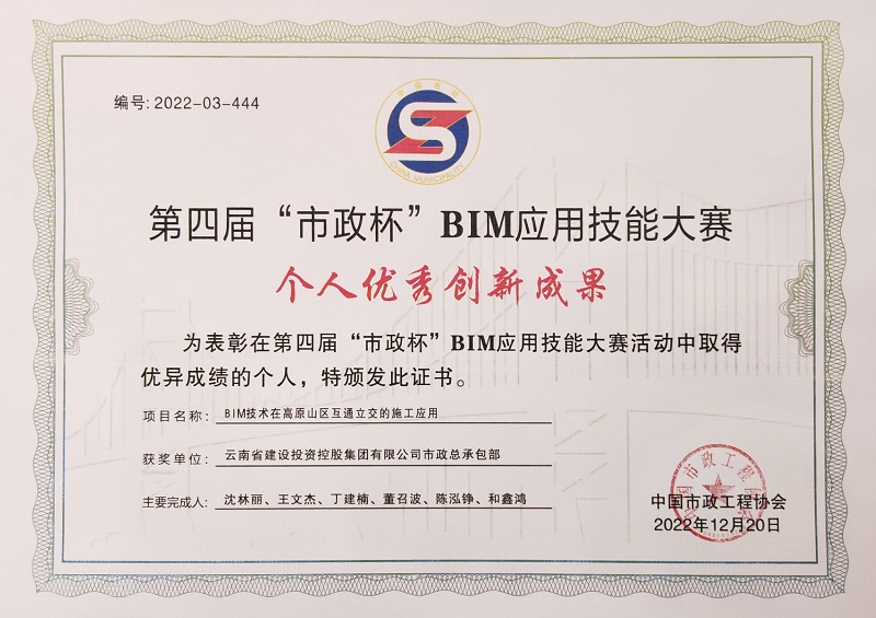 1月10日至12日,由中国市政工程协会举办的第四届“市政杯”BIM应用技能大赛成果发布大会在广西南宁举行。市政部BIM小组以蔓金高速阿得博互通式立交为载体形成的成果“BIM技术在高原山区互通立交的施工应用”荣获施工组一等奖,所有BIM小组成员取得个人优秀创新成果,这是世界杯足球网属企业在成果发布大会上获得的唯一奖项。