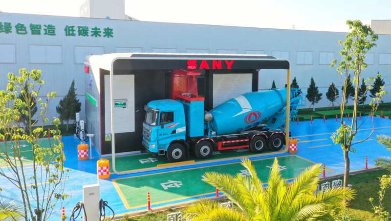 一期项目主要在经开基地高分子公司厂房和文体中心厂房屋顶安装光伏,屋顶总面积为5956.76平方米,光伏板安装面积为5361.08 平方米,装机功率828kWp,采用目前国内最先进的单晶硅N型板,目前已发电1584.44度并实现并网。走进经开绿色生产基地,整齐排列的光伏板在阳光照射下熠熠生辉,重卡充换储能源站在绿树红花的掩映下格外耀眼,新能源拖车、纯电动装载机、纯电动搅拌车等绿色新能源装备有序充电,传统混凝土企业正焕发勃勃生机……