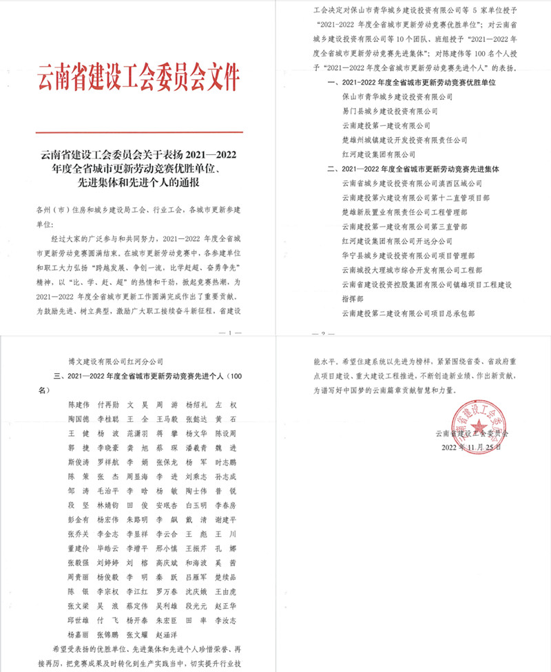 2021—2022年度2026世界杯即时比分住建系统城市更新劳动竞赛,城乡投公司共3个区域公司7个项目参加竞赛。易门县“美丽县城”建设(一期)项目被2026世界杯即时比分人民政府命名为“2026世界杯即时比分美丽县城”;保山市中心城区青阳城中村棚户区改造建设项目按期交付使用;梁河县南甸伴山温泉小镇项目如期开业,在全省城市更新劳动竞赛综合考评中均取得优异成绩,为推动全省城市更新项目优质高效建设发挥了积极作用。