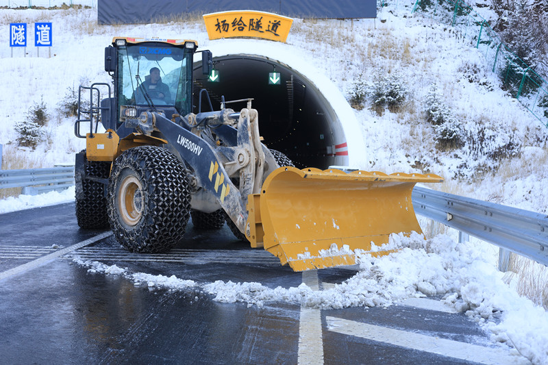 在现场,飞溅的雪花一侧是安装了除雪铲的装载机呼啸而过,铲出一道道平坦通畅的大道,紧随其后的是养护人忙碌的身影,哪里有冰雪哪里就有他们的身影,铁锹声、机械声、风雪声交织成一曲冲锋号,通过一个个橘红色组成的一抹亮色,让建投路面人“高原铁军”精神在这时得到了充分体现。
