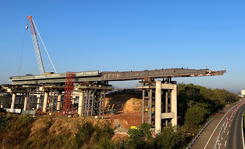 全桥采用高空拼装后步履式顶推施工,最大顶推重量约850吨,共计顶推120米,标志着项目建设进入大干快上的关键期。