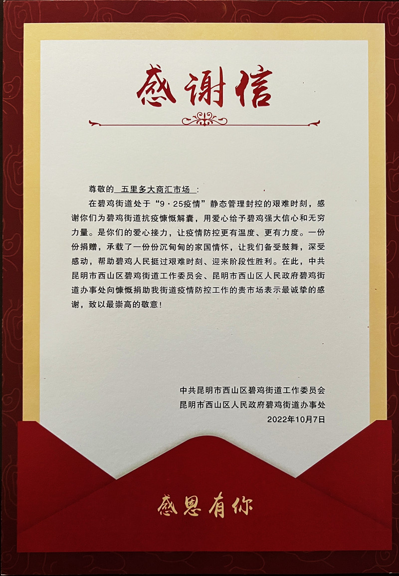 近期,建机公司五里多大商汇菜市收到了来自西山区碧鸡街道的感谢信和锦旗、前卫街道同德锦江社区的锦旗,感谢建机公司五里多大商汇菜市全体工作人员一直以来在抗击疫情、支持和保障各街道社区物资供应方面做出的努力和贡献。