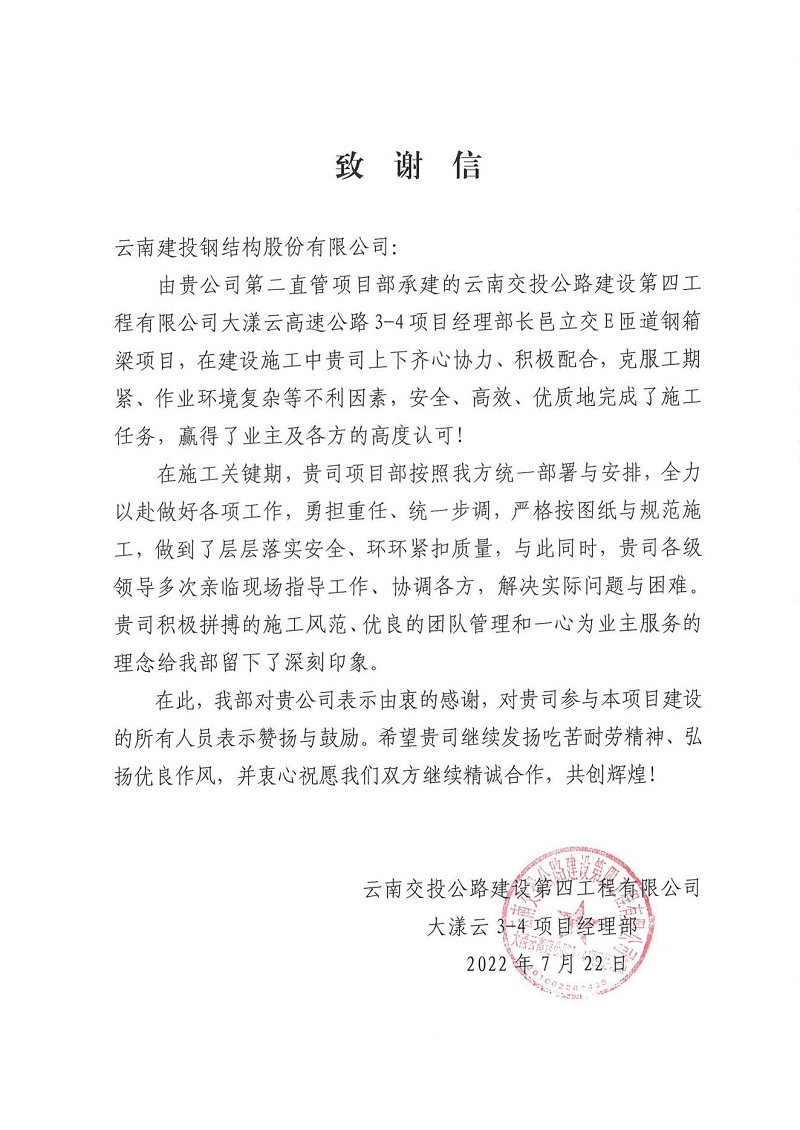 7月22日,大漾云高速长邑立交项目总包方致信感谢钢构公司,对项目部层层落实安全,环环紧扣质量,安全、高效、优质完成项目建设给予高度认可,对公司积极拼搏、勇担重任的施工风范、优良高效的管理服务给予高度赞扬和感谢。