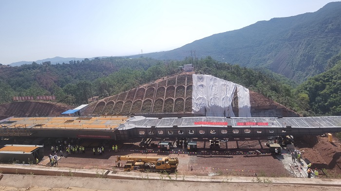 7月7日,永金高速永仁至大姚段陈家沟大桥左幅钢箱梁首次顶推到位,全面进入桥梁上部结构施工阶段。
