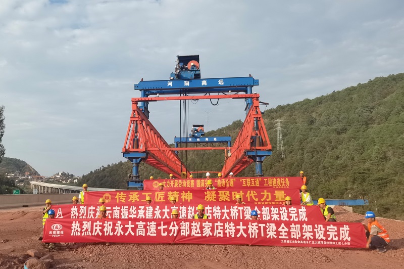 6月30日下午,永大高速赵家店特大桥左幅最后一片T梁架设完成,大桥实现双幅贯通。