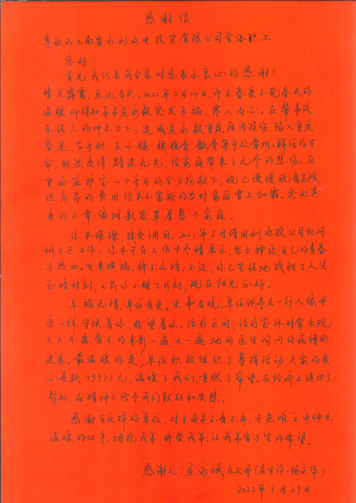 今年2月的一晚,借调到红河片区工作的屈永毅同志不幸遭遇严重车祸,高昂的手术费、医药费对这个本不富裕的农村家庭而言无异于雪上加霜。获知讯息后,水投公司委派专人参与当晚的救治和陪护工作,并及时送去2000元慰问金。了解到治疗费用压力大的情况后,水投公司党委、工会进一步向全体干部职工发出倡议,号召大家弘扬“一方有难,八方支援”的中华民族传统美德,学习雷锋、伸出援手,共同帮助屈永毅同志渡过难关。通过领导干部带头、职工自愿参与的方式,短短时间内筹集到爱心捐款79972元。