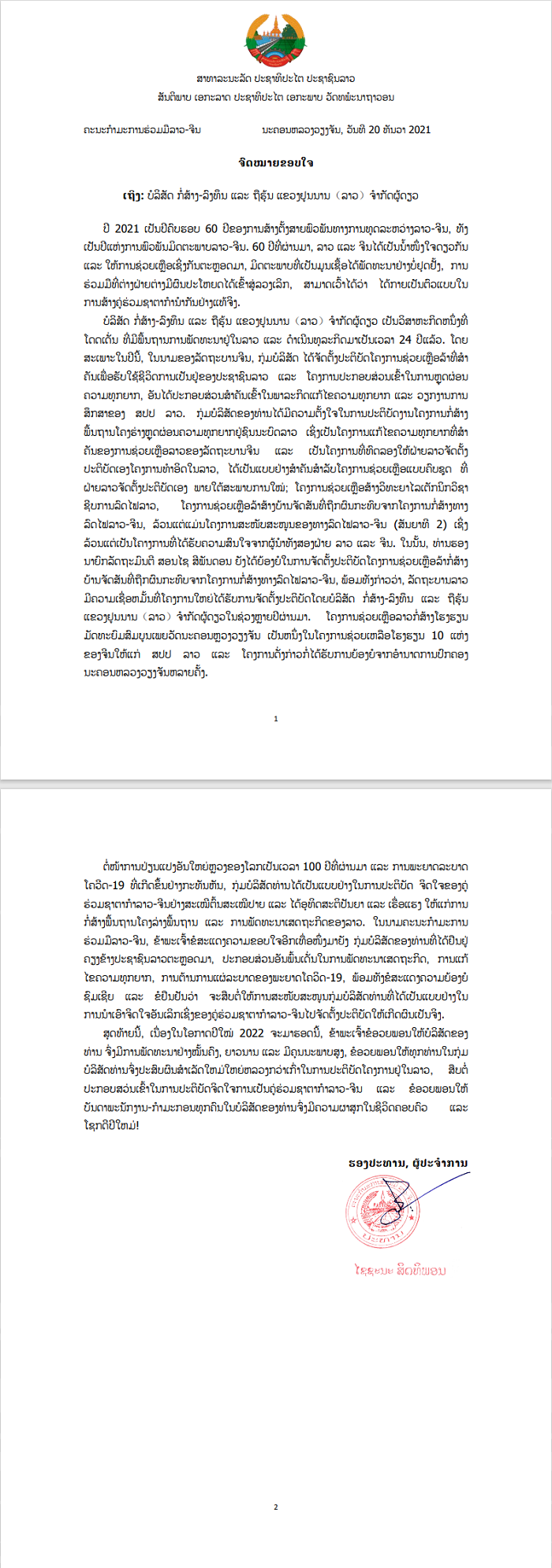 老中合作委员会写给集团的感谢信中提到,援老挝万象市皮瓦中学项目为中国援老10所学校的重点项目之一,多次受到万象市政府表扬。面对世界百年之大变局和突发疫情,世界杯官网合作平台集团始终践行老中命运共同体建设精神,为老挝的基础设施建设和经济发展贡献智慧和力量。老中合作委员会向集团的突出贡献表示感谢,对集团作为深入践行老中命运共同体精神的典范表示赞赏和坚定支持。
