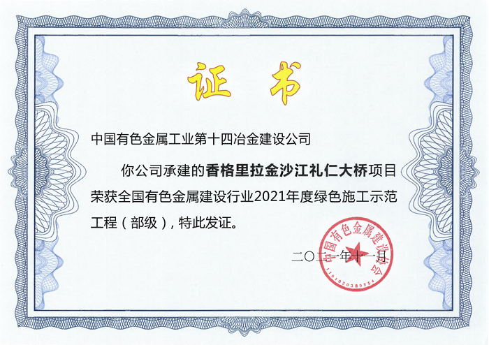 近日,中国有色金属建设协会公布2021年度绿色施工示范工程名单,十四冶承建的香格里拉金沙江礼仁大桥项目和老挝万万高速公路土建施工第7工区项目成功上榜。