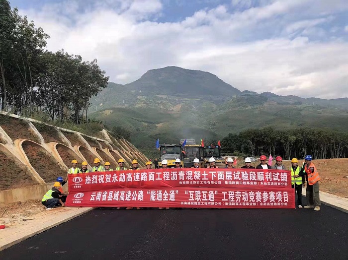 12月22日,永勐高速公路沥青路面下面层试验段在E匝道铺筑完成。