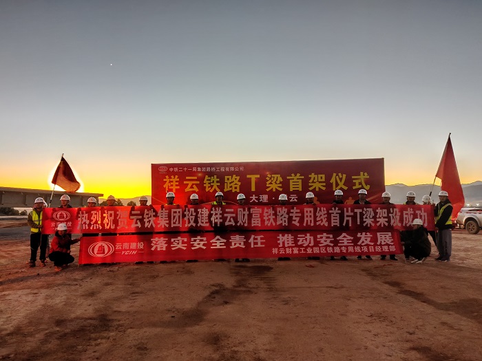 12月17日下午,随着运梁车将32米长、134吨重的T梁缓缓运至桥头,经过提梁、喂粱、移梁、落梁、固定等工序,由云铁公司承建的祥云财富工业园区铁路专用线首片T梁架设成功。