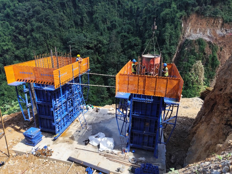 芒市北互通主线1号大桥作为芒市北互通的关键线路工程,全长330米。上部结构采用预应力混凝土T梁,先简支后结构连续;下部结构采用实心墩及柱式墩,墩台为桩基础。本次浇筑的左幅3#墩为双肢变截面实心墩,墩柱尺寸为1.7米×3.05米×高50米。