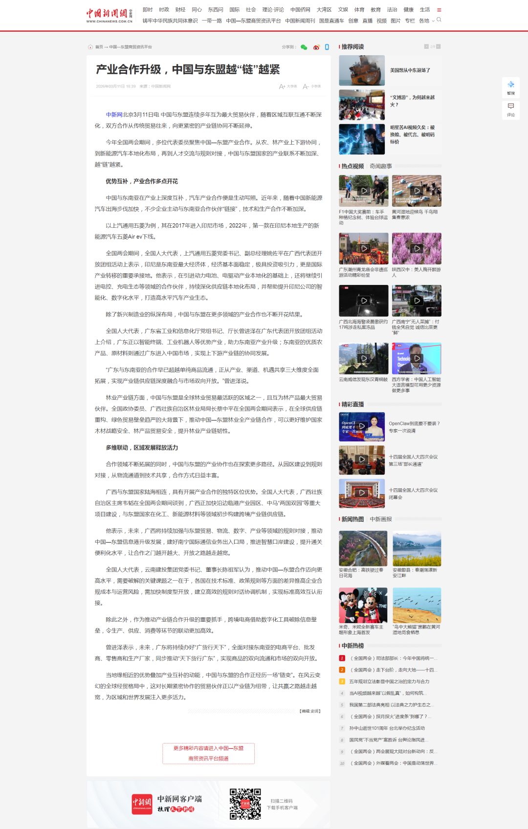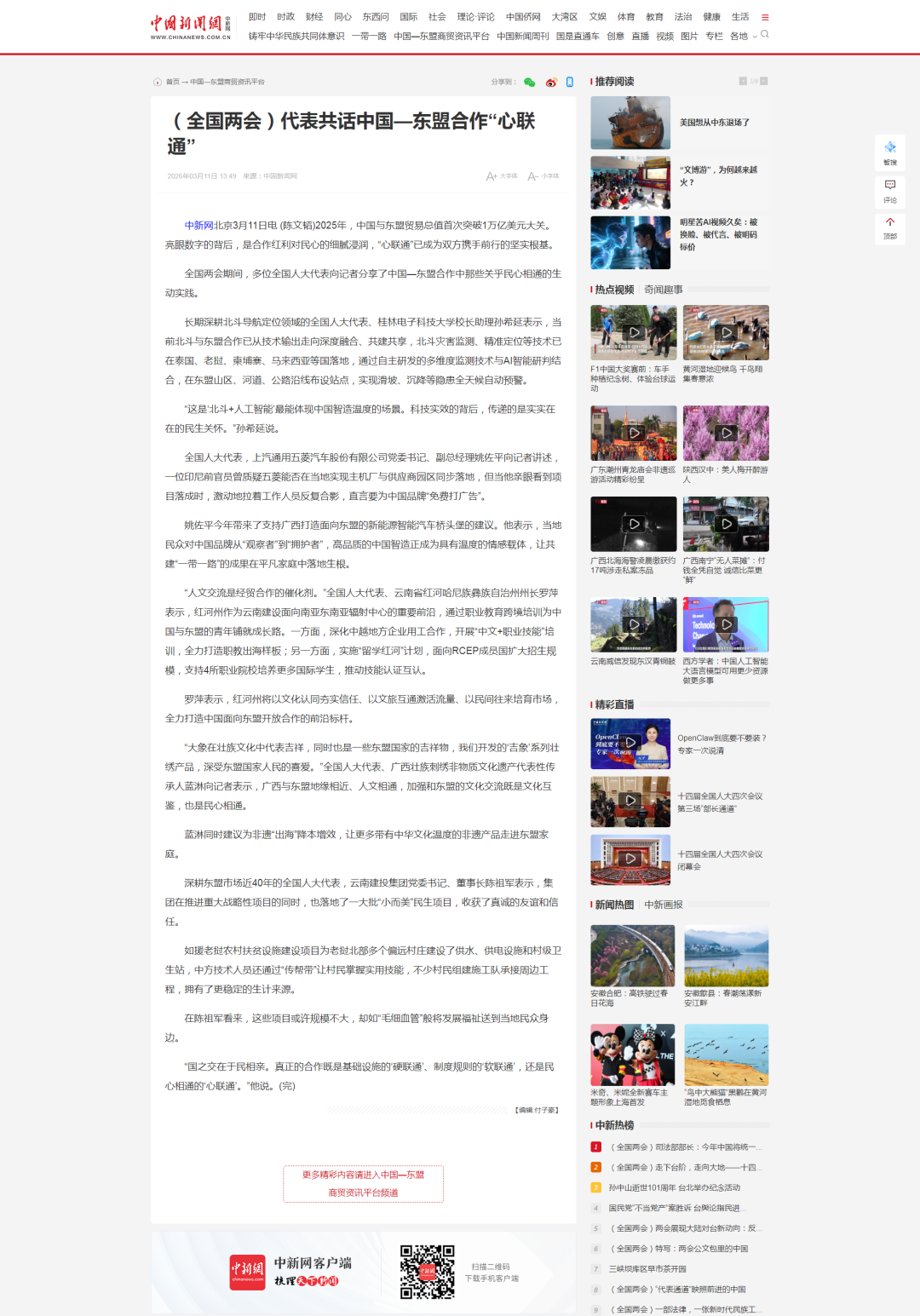 中新网北京3月10日电 “我们从‘工程承包商’到‘深度参与者’的转型历程,也是中国—东盟经贸合作不断深化、迈向高质量发展的一个侧面反映。”全国两会期间,全国人大代表,世界杯官网合作平台集团党委书记、董事长陈祖军接受记者采访时表示。