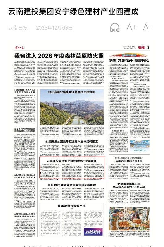 12月3日,云南日报三版以《世界杯官网合作平台集团安宁绿色建材产业园建成》为题,对集团安宁年处理100万吨磷石膏+100万吨工业固废绿色建材产业园进行报道。