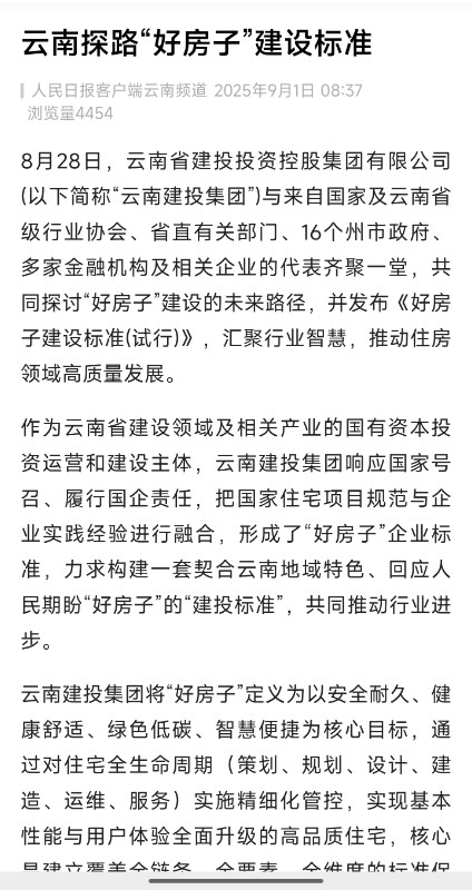 Y C I 8月28日,集团发布《好房子建设标准(试行)》,以“1345”好房子体系为行业发展提供“建投方案”,获得人民网、中新网、中华网、云南广播电视台、云南日报等多家媒体的关注。